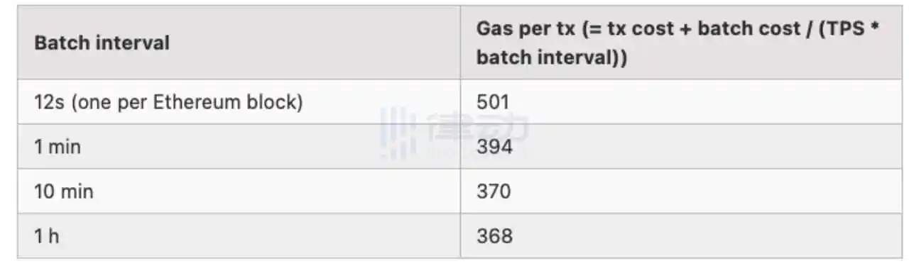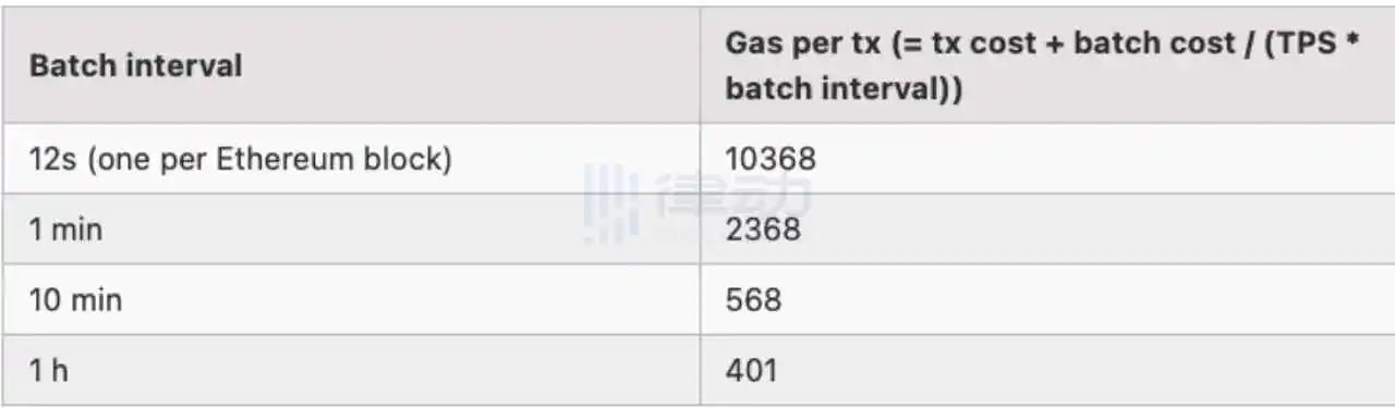 為了給我們一些具體的數字,讓我們考慮一個每批成本為 600,000 gas ZK rollup 並處理每筆交易成本為 368 gas 的完全優化的 ERC20 傳輸(23 字節)。假設此 rollups 處於採用的早期到中期,TPS 為 5。我們可以計算每筆交易與批次間隔的 gas: