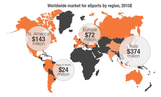 SuperData Research稱,電子競技市場的收入主要來自韓國和中國,那裏的電子競技消費群十分龐大,而且擁有較長的發展歷史。但得益於《英雄聯盟》、《Dota 2》和《反恐精英》等游戲的的流行,歐洲和美國的電子競技市場也在迅速發展。