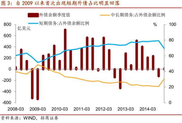 面對強勢美元,去年第四季度外債規模止跌微增,增速較此前顯著放緩。自2009以來第一次出現短期外債占比明顯回落,而中長期外債的占比上升。