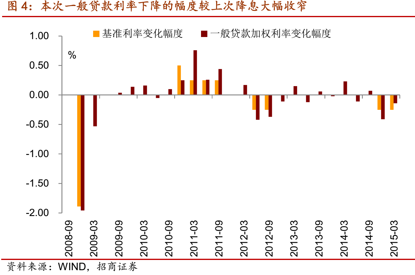 降息對降低企業融資成本的作用顯著,未來引導實體經濟進一步降低融資成本仍需要利率工具的配合,我們認為存在降息的可能性。在降息25bp之后,3月末加權平均利率較去年末下降22bp,其中一般貸款加權利率下降15bp,票據融資加權利率下降27bp,執行上浮利率的貸款占比上升。值得注意的是,一般貸款利率下降的幅度較上次降息大幅收窄。2014年10月降息25bp,一般貸款利率下降44bp,與之對比,今年2月降息25bp,一般貸款利率僅下降15bp,幅度顯著縮小,反映貨幣政策的傳導不通暢。其次, 2月降息讓定期存款利率下降18bp,活期存款利率基本未變,這使得降息對銀行負債端成本下滑的貢獻有限,甚至央行還在報告里面提到“商業銀行負債成本提高”,因此,央行資產端的收益率很難下降,降息的效果打了折扣。