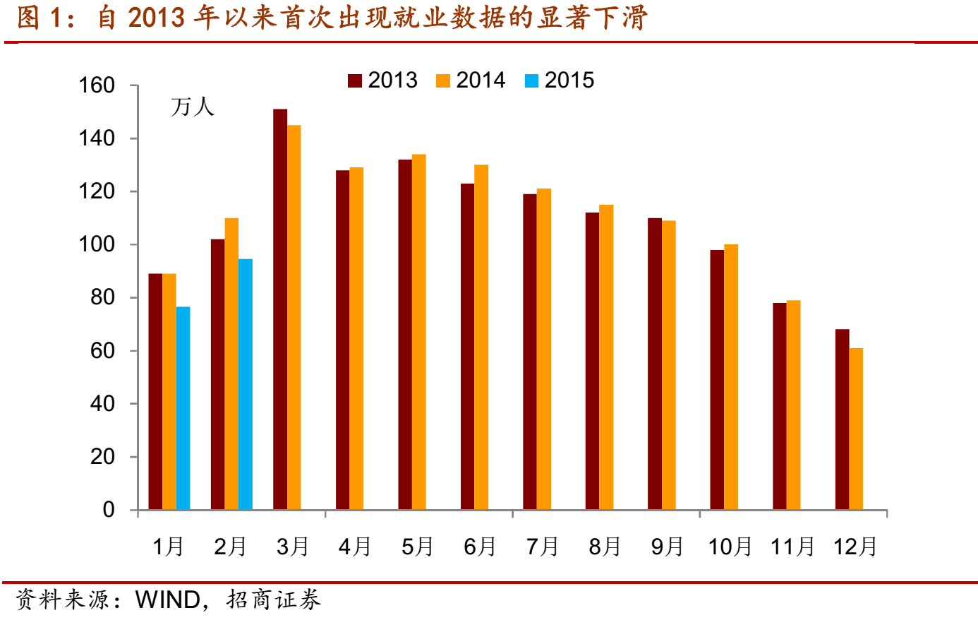 就業市場惡化,我們此前多次強調從就業角度看待穩增長政策的必要性。“第一季度,全國城鎮新增就業同比少增20萬人”,從2013年公布該項每月數據以來,第一次出現顯著回落。主要是制造業、零售業、住宿餐飲業和服務業用人需求同比下降幅度較大,應屆高校畢業生求職人數上升。此外,與去年四季度對初級專業需求增加不同,一季度對高級工程師的需求增長。