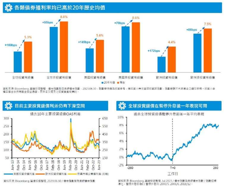 聯準會 7 月利率會議一如市場預期再升息 1 碼,儘管決策聲明保留今年底前進一步升息的可能性,市場普遍預期升息循環已進入尾聲。富達認為,評估目前各類債券之殖利率均超過 20 年歷史均值、主要投資級債利差仍有下滑空間、歷史經驗顯示全球投資級債在暫停升息後一年表現可期等因素,全球優質債券無論評價面和收益面皆具吸引,掌握「全球」、「優質」、「靈活」是關鍵。