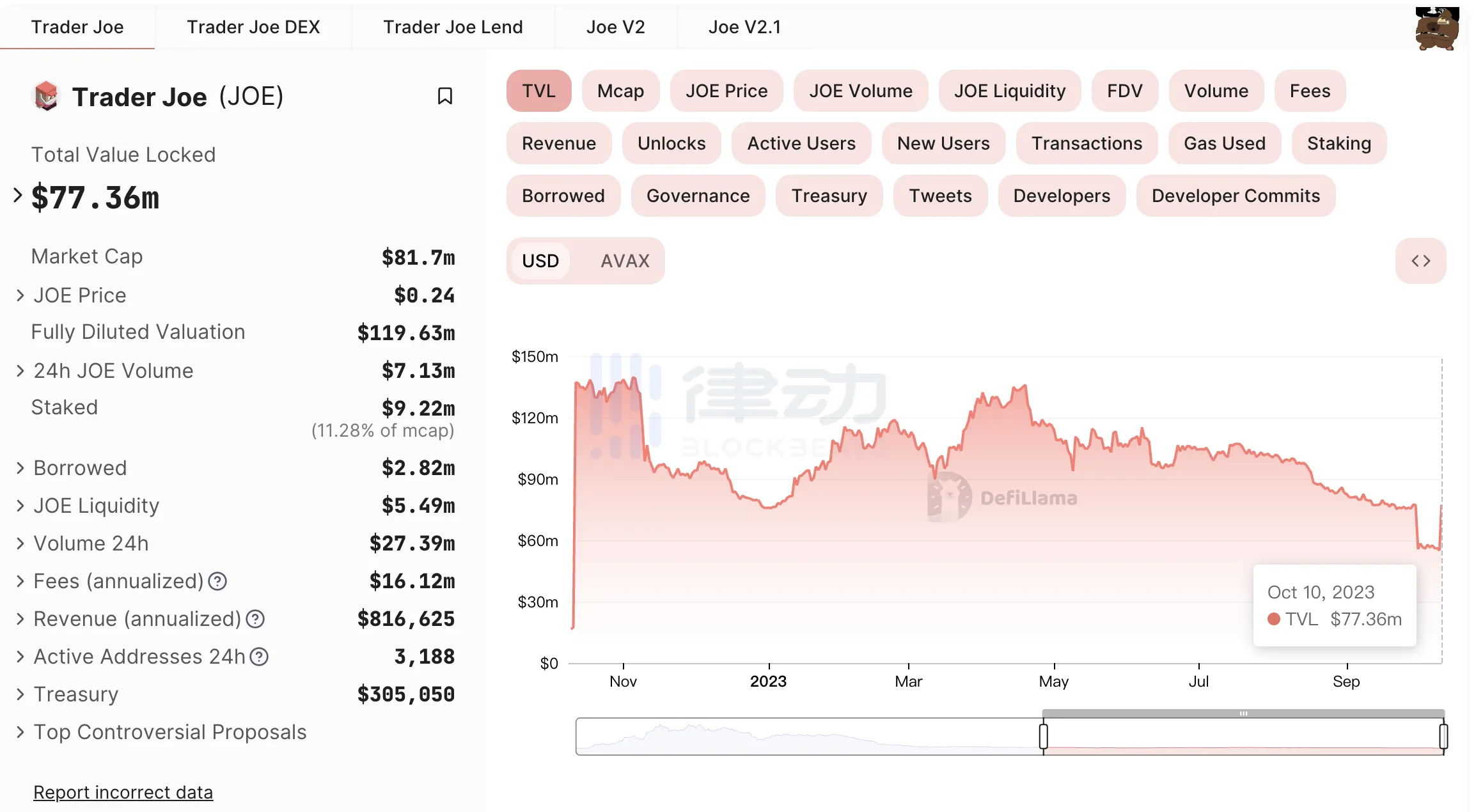 今年 8 月,Trader Joe部署至以太坊主網。此前,Trader Joe 已上線了 Avalanche、Arbitrum、BNB Chain 等網路。據 DefiLlama 數據,Trader Joe 在 Arbitrum 鏈上總鎖倉量達到 7736 萬美元,生態活躍度近期不斷升溫。