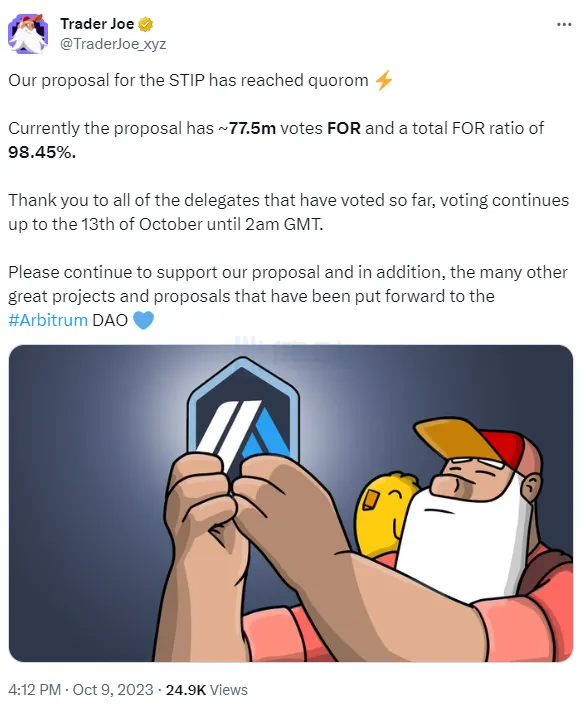 9 月 26 日,Trader Joe 在 Arbitrum 社區發布提案,向 Arbitrum DAO 財庫申請 183 萬枚 ARB 撥款,隨後,Trader Joe 將數量下調至 151 萬枚,這筆撥款用於提高現貨流動性和交易效率。目前,該提案的投票支持率為 98.45%。
