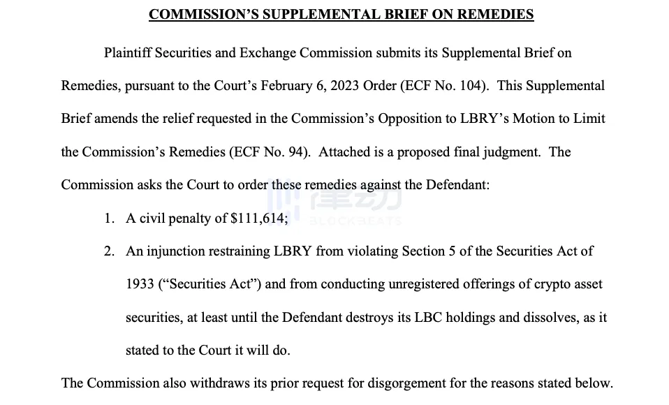 然而,這也並不意味著 LBRY Inc. 的勝訴。5 月,據一份法庭文件顯示,SEC 尋求修改其針對 LBRY Inc. 的 2200 萬美元處罰,要求法院對其處以 111,614 美元民事罰款。因為 SEC 認為 LBRY Inc. 已停止營運,沒有資金支付更高的罰款,因此選擇降低罰款金額。