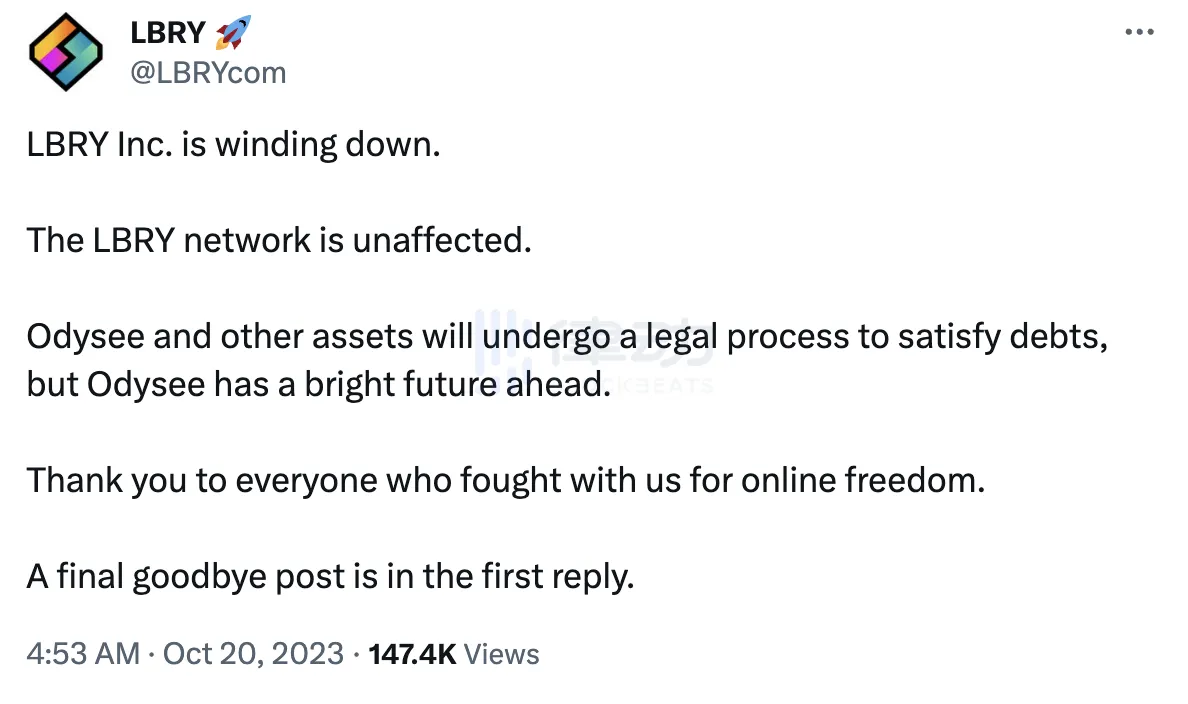 7 月,LBRY Inc. 官方宣布,「依據法院命令和自身承諾,預計將在未來幾個月內清盤 LBRY Inc.,目前 LBRY 網路上有 3000 萬條內容和 170 萬個鏈上身份」。