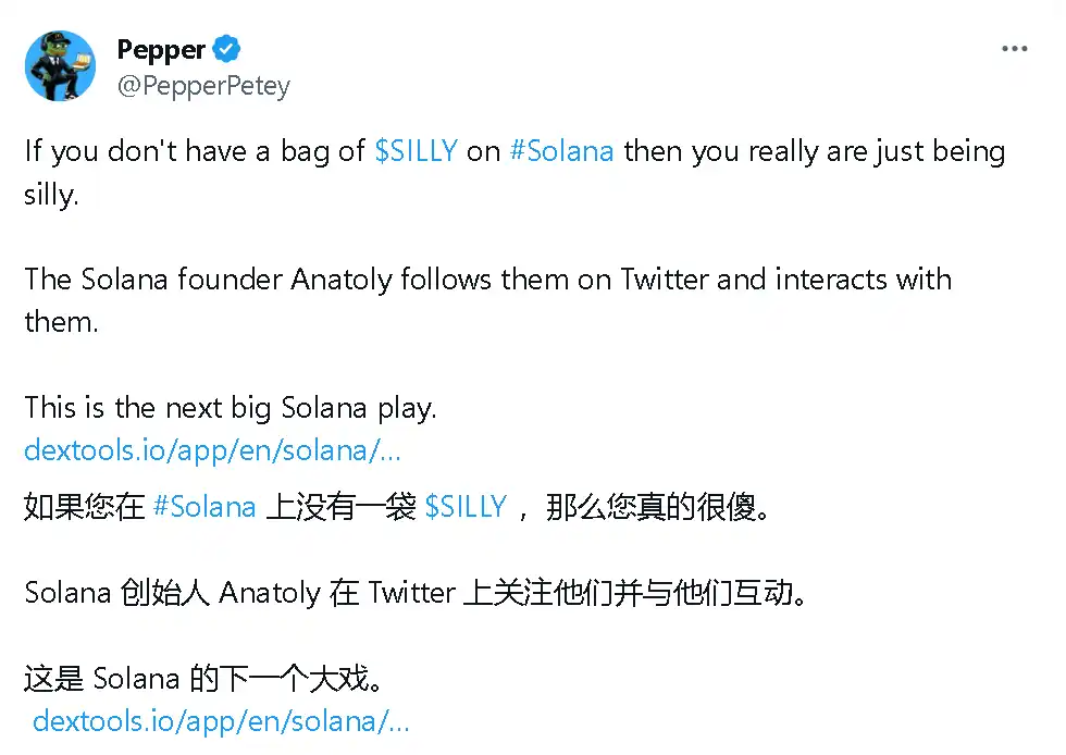 Anatoly 關注並轉發 Silly Dragon 推文的截圖也在社區引發討論,這也因此成為很多人看漲 SILLY 的原因。加密研究員 Pepper(@PepperPetey)在社交媒體平台發文表示「這是 Solana 的下一個大戲」。