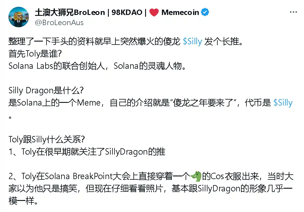 此外,加密研究員 @BroLeonAus 也在社交媒體平台發文表示,「我是全程看了 Solana Breakpoint 直播的,也是那次讓我堅定了全力深入 Solana 的決心,社區小夥伴跟着我從抓 Sol 的漲幅開始陸續吃到了 Backpack 空投,Jito 二級和其它一些生態紅利。最重要的是,在 BreakPoint 當時其實沒提到幾個項目,但是提到的每 一 個 都拉飛了。 SillyDragon 出場的其實比較隱晦,直到現在反過去看才能發現原來 Anatoly 是藏了彩蛋的。」