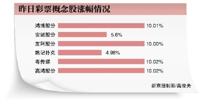 目前,A股的彩票概念股包括鴻博股份、安妮股份、友阿股份、姚記撲克、粵傳媒、高鴻股份等。其中,鴻博股份的無紙化彩票業務目前已經與支付寶、騰訊大粵網、中國銀聯等展開合作,粵傳媒旗下有彩票信息與彩票代購服務平台雲彩網。