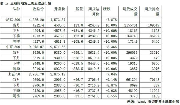 三股指期貨合約跌幅均超過標的數,其中 if 、ic 合計八個股指期貨 合約均跌停, ih 期貨合約跌幅也遠超標的。三股指各自主力收盤貼水均 期貨合約跌幅也遠超標的。三股指各自主力收盤貼水均 大幅擴,上周五來看市場情緒極其悲觀。