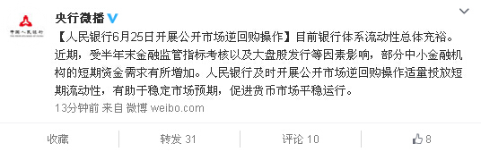 央行表示,目前銀行體系流動性總體充裕。近期,受半年末金融監管指標考核以及大盤股發行等因素影響,部分中小金融機構的短期資金需求有所增加。人民銀行及時開展公開市場逆回購操作適量投放短期流動性,有助於穩定市場預期,促進貨幣市場平穩運行。