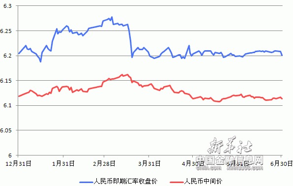 北京(CNFIN.COM / XINHUA08.COM)--6月30日,人民幣兌美元即期匯率收盤大漲80個基點,半年結束收於6.20關口附近。6月人民幣即期匯率微幅下跌0.04%,2015年以來累計升值0.05%。人民幣兌美元中間價當日報6.1136,6月升值0.1%,半年累計升值0.09%。
