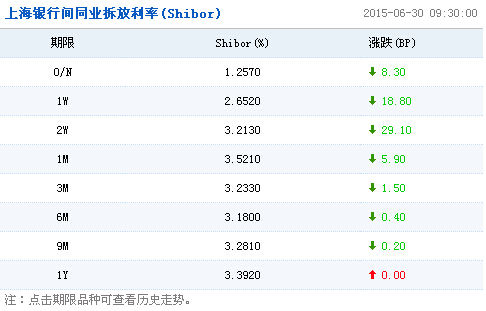 上海銀行間同業拆放利率(Shibor)顯示,隔夜Shibor報1.2570%,下跌8.30個基點;7天Shibor報2.6520%,下跌18.80個基點;3個月Shibor報3.2330%,下跌1.50個基點。