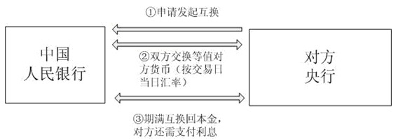 央行稱,通過協議,任何一方可以發起交易,以一定數量的本幣交換等值的對方貨幣。互換的發起和收回都為本幣,並不承擔匯率風險。以對方央行發起動用我方人民幣為例,本幣互換發起動用流程如下: