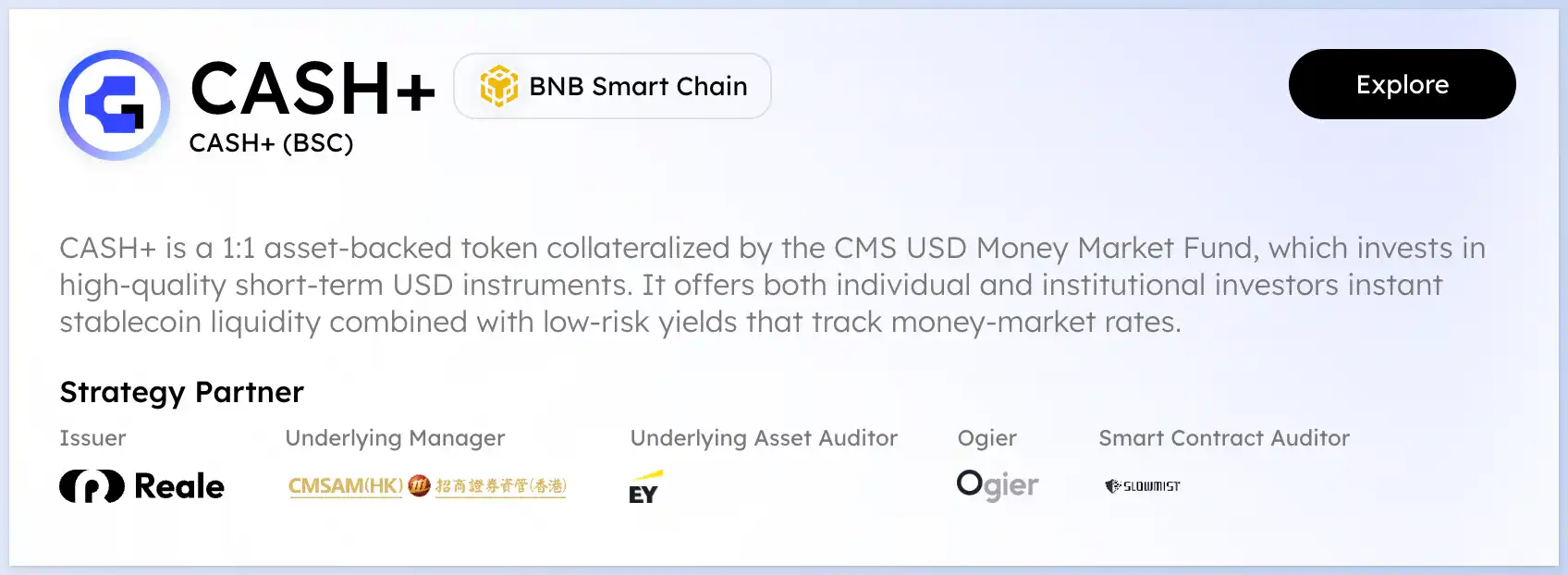 筆者特意翻了下他們的官網,CASH+ 其實年利率是一款 RWAWA 4.37%),底層資產是招商證券資管(香港)管理的美元貨幣市場基金,基金主要投向高品質的美元短期金融工具。簡單來說,個人或機構買了 CASH+,既能拿到貨幣市場基金的低風險收益,還能享受鏈上的即時流動性。現在 CASH+ 已經被多家 DeFi 協議納入合格抵押品。該代幣底層資產由招商證券資管(香港)負責管理,也難怪這次 BNB Chain 的活動,Asseto 會和招商證券資管(香港)攜手亮相。值得一提的是,除了 CASH+,Asseto 即將上線的產品 AmSRS 同樣由招商證券資管(香港)擔任投資管理方,雙方的合作顯然已經非常深入。