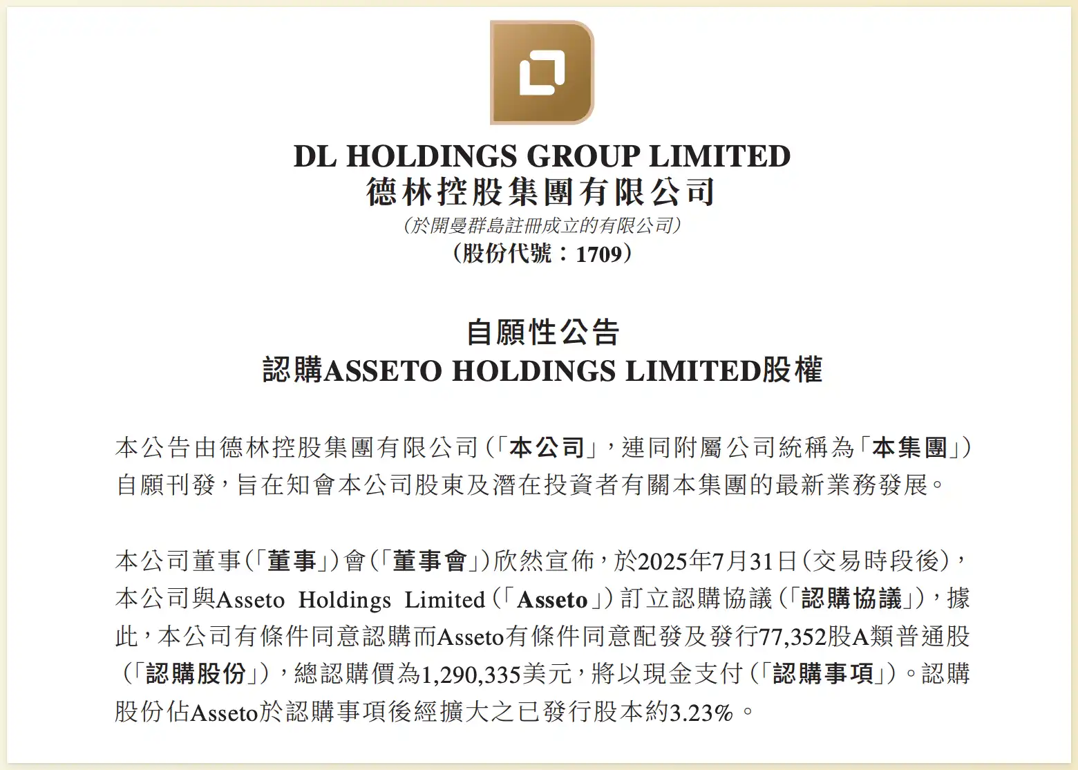 月末,Asseto 再獲傳統金融領域的上市公司-德林控股集團的策略注資。德林控股透過此次投資,旨在藉助 Asseto 的區塊鏈技術與資產網絡,切入快速成長的 RWA 賽道,推動其全球資產管理業務的數位轉型並豐富其產品組合。