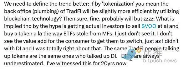 一些觀點認為,代幣化並沒有為終端投資者帶來額外價值。彭博 ETF 分析師 Eric Balchunas 指出:ETF 本身已是低成本、流動性強、門檻低的產品,幾乎沒有被取代的理由。