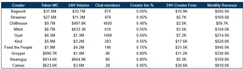 看看 Pump 首頁上的 10 個創作者幣,大多數都已經產生了可觀的日收益。在 Twitch 上,要達到六位數的收益需要 1 萬+ 的同時在線觀看人數。而在 Pump,創作者透過規模較小的社群就能實現類似的收入水準。