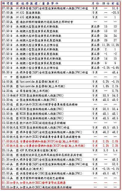 隨後美國聯邦住房金融局 (FHFA) 公布 7 月房屋價格較去年同期漲 2.3%,但較前月跌 0.1%,並據數據顯示 9 月芝加哥採購經理人指數 (PMI) 為 40.6 及美國 9 月消費者信心指數為 94.2 皆遜於預期,同時美國 8 月職位空缺及勞動力流動調查 (JOLTS) 稱職位空缺增至 722.7 萬個,但招聘人數下降,符合勞動力市場低迷,而且若美國共和與民主兩黨未能達成臨時協議,一旦撥款期限週二到期政府面臨停擺,將推遲就業報告發布,打擊美元兌日圓跌至 147.63 低點。預估今日美元兌日圓阻力於 148.20-30,支撐於 147.00-20。