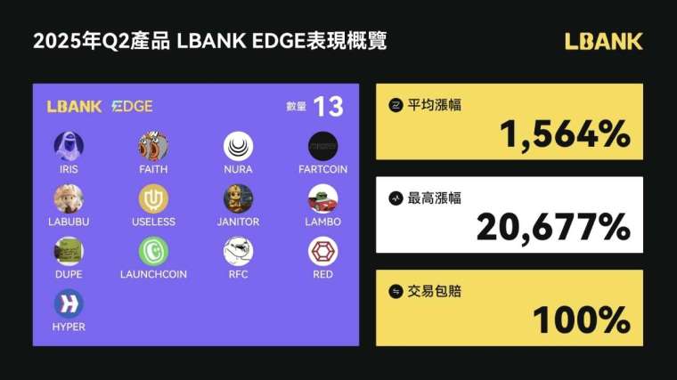 回顧 2025 年初至今的表現,不難發現這套策略已多次奏效:從 Trump 相關資產的早期上線,到 B、Launchcoin 的爆發,再到 Letsbonk 生態的持續發酵,LBank 成功捕捉了每一輪敘事風口。截至 8 月初,平台已出現多個漲幅超萬倍的高收益案例,例如 Launchcoin(+15,194%)、DUPE(+13,367%)、RFC(+10,847%)等,共同構成了 2025 年加密市場最亮眼的上幣戰績。