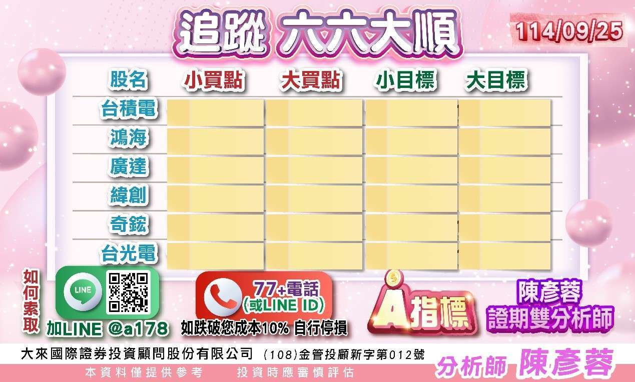 大來投顧陳彥蓉指出,美股受 8 月 PCE 增速溫和,通膨壓力未有惡化,四大指數止跌重回攻擊,有續創高機會;台股受出口逼近 600 億美元,帶旺製造業強勁,降息循環資金加持有再戰新高時候。上週預告山雨欲來,提醒高檔過熱要小心,果然台股連跌三天,週五更大跌超過 500 點。接續盤勢不殺低,權值震盪飆股黃金買點將乍現,中秋起義迎 10 月,翻倍飆股隨時出手!