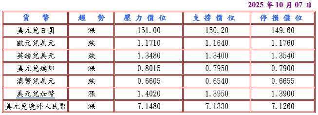 隨著美國政府持關門,缺乏官方經濟數據指引,分析師和央行觀察人士通過其他模型或數據源了解美國經濟狀況,芝加哥商業交易所的 FedWatch 工具顯示,美國聯邦準備理事會 (FED) 將在 10 月降息 25 個基點的機率達 96.7%,並據 Haver Analytics 數據,截至 9 月 27 日當周初請失業金人數經季節調整增至 22.4269 萬人,突顯招聘停滯,但裁員人數仍處於低位,而且日本執政自民黨新黨魁引發財政和政治穩定性憂慮導致日圓走弱,美元兌日圓漲至 150.47 高點。預估今日美元兌日圓支撐於 150.00-20,阻力於 151.00-20。