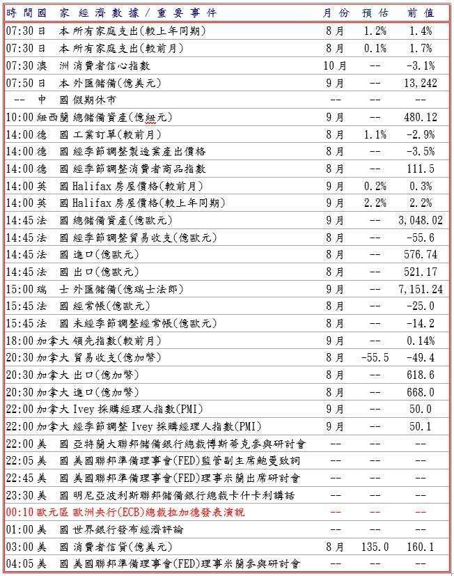 隨後調查顯示歐元區 10 月 SENTIX 投資人信心指數升至負 5.4 優於預期,並據歐盟統計局公布歐元區 8 月零售銷售較前月增長 0.1% 符合預期,但較去年同期減至 1.0%,而且消息人士稱,德國失業率可望隨著經濟復甦加快下降,但歐洲央行 (ECB) 副總裁德金多認為斯歐元區通貨膨脹表現符合央行預期,物價上漲過快或過慢的風險正相互平衡,但 ECB 總裁拉加德表示歐元區通貨膨脹前景比以往更不確定,但風險範圍已縮小,打壓歐元兌美元至 1.1649 低點。預估今日歐元兌美元阻力於 1.1710-30,支撐於 1.1620-40。