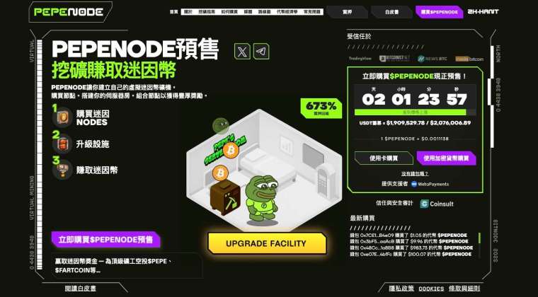 另一個備受矚目的新秀是 Pepenode($PEPENODE),它重新定義了迷因與礦業的結合。該專案建立於乙太坊網絡,允許使用者透過購買「Miner Nodes」來建立虛擬挖礦間,模擬挖礦過程並獲取真實代幣獎勵。預售階段的年化報酬率高達 673%,吸引大量早期參與者爭相進場。
