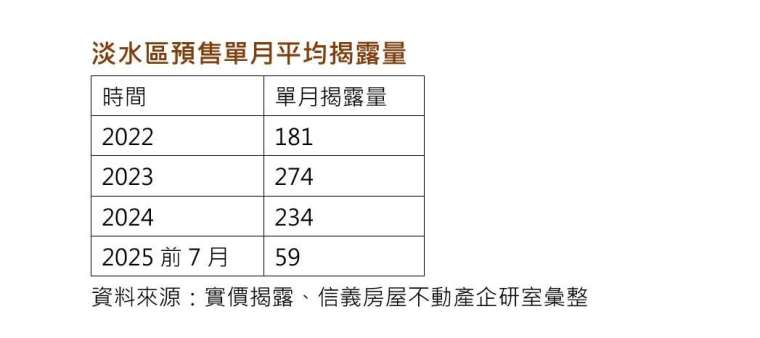 統計顯示,從 2021 年 7 月實價登錄 2.0 上路以來,淡水地區的預售揭露就將近 1 萬戶,第七波管制前一年平均單月淡水預售揭露 301 戶,反映淡水在房價相對平價與捷運、淡江大橋興建的利多下,吸引不少民眾進場購買預售案,不過就在第七波選擇性信用管制上路後,單月揭露平均剩下 74 件,較第七波前一年單月平均就少了 75%。