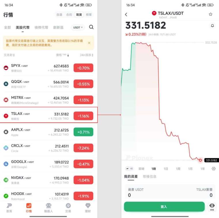 打開 Pionex APP,點擊頁面下方的「行情」按鈕,切換至「現貨」-「美股代幣」,選擇您希望投資的美股代幣,進入詳情頁,點擊【買入】,即可買入美股代幣。