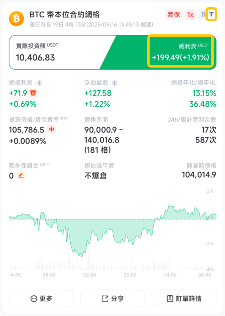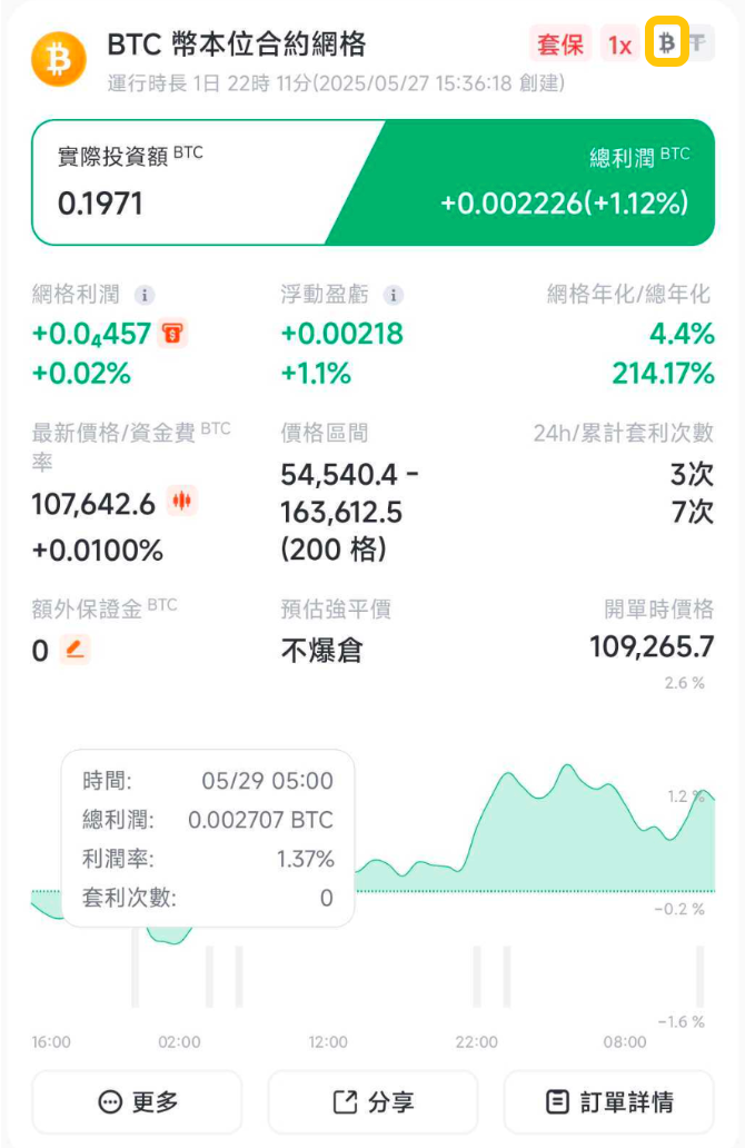而套保的原理是幣本位 1 倍做空。不僅可以賺資金費,當幣價下跌時可以賺幣,幣價上漲時可以賺 U,還可以賺取網格利潤。