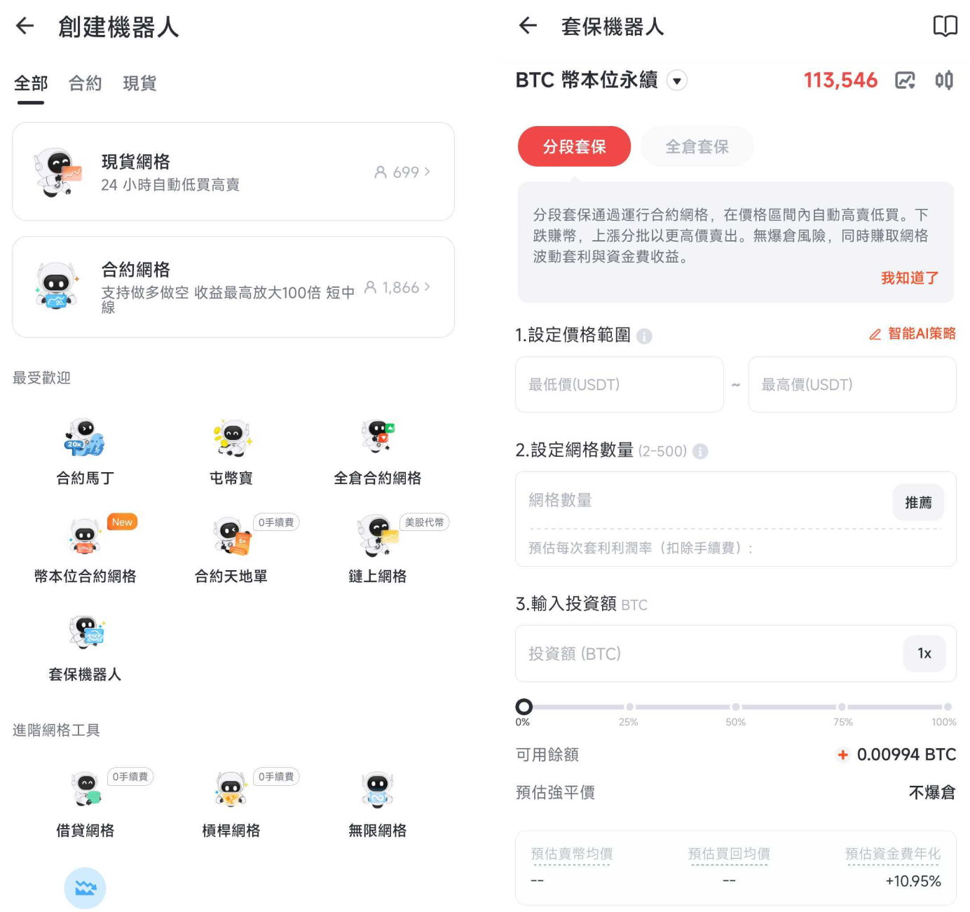 1. 機器人 - 套保機器人,根據你的投資策略,選擇使用分段套保或全倉套保。