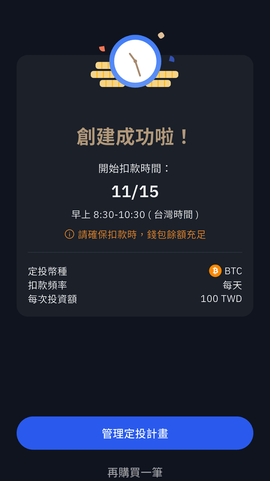 用戶能指定數量定期購買虛擬貨幣 ,建立屬於自己的投資計畫!購買之價格將依照定期定額扣款當下而定,目前為固定台灣時間 08:30-10:30 之間扣款。