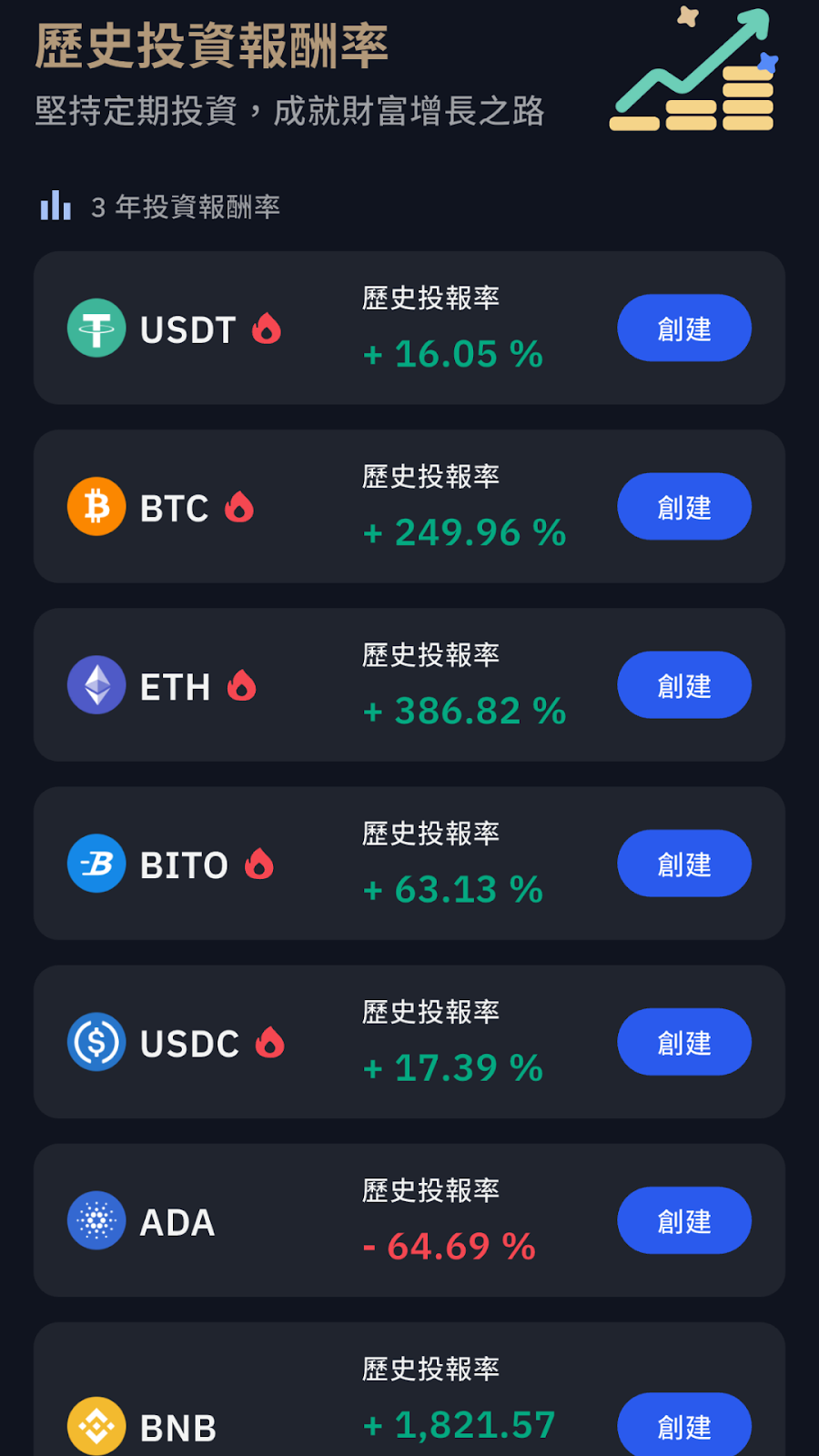 你可以參考點選幣種旁的「創建」,輕鬆設定定期定額