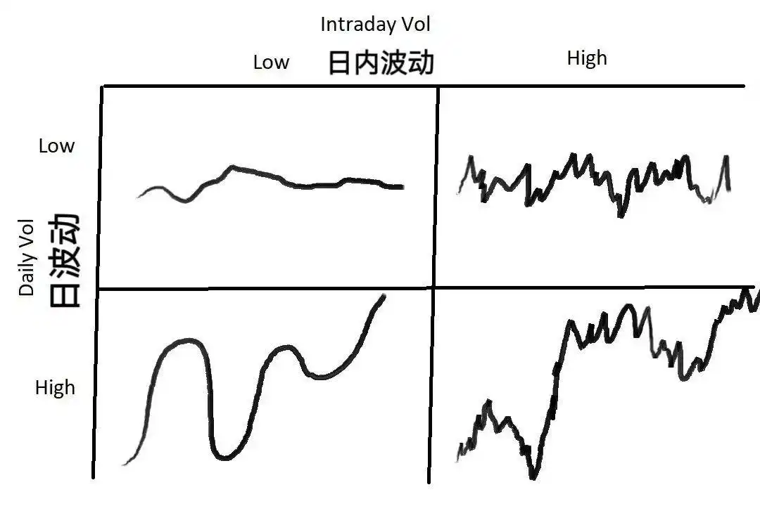 波動性簡單來說,就是價格離其平均值的偏離程度,不同的時間窗口下價格的波動性是不同的。一個品種可能在 1 分鐘等級的 k 線圖上上躥下跳,而在日線圖上的走勢波瀾不驚。成交量則告訴我們了流動性,流動性會影響掛單的 spread 和成交頻率。