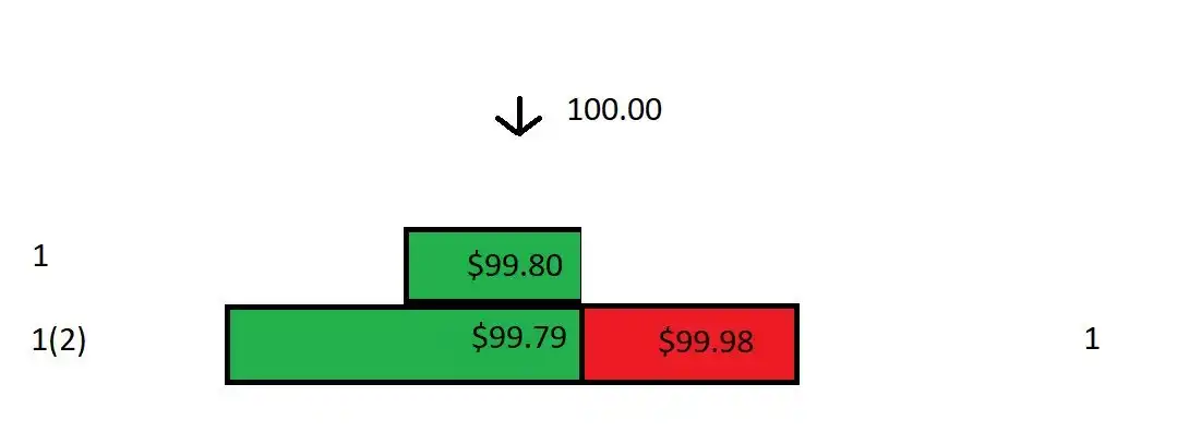 因為買一被拿掉了,所以訂單薄的結構變了,現在的 spread 變成了 0.02。但市價還是 100,因為這是最後一個成交的價格: