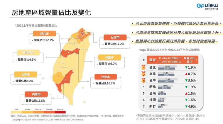 在區域聲量分布上,意藍資訊指出六都與新竹縣市仍是全台房市討論主力,合計佔比達 81.4%。各縣市聲量占比排名依序為,台北市、高雄市、台中市、新北市、台南市、桃園市、新竹縣市。