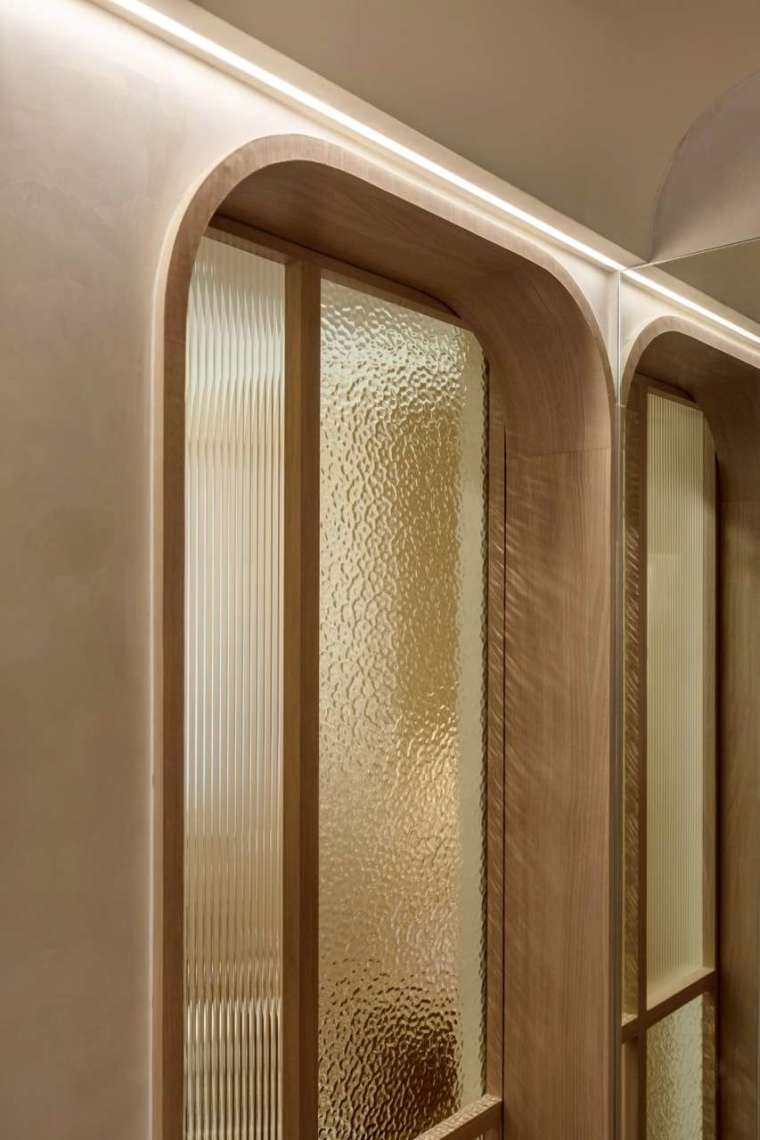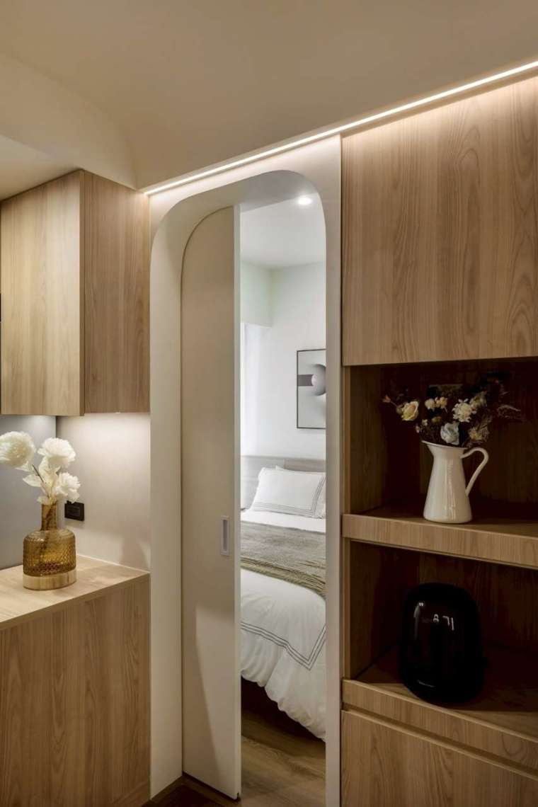 邁入私領域,書房兼多功能室與主臥室入口皆以圓拱造型門片處理,柔化了狹長格局可能帶來的壓迫感。其中書房兼多功能室的門片採用長虹與水波紋玻璃拼接,維持透光之餘亦確保隱私;內部牆面與臥榻皆規劃充足的收納設計,甚至臥榻本體亦內藏上掀櫃與抽屜,將儲物功能發揮至極致。
