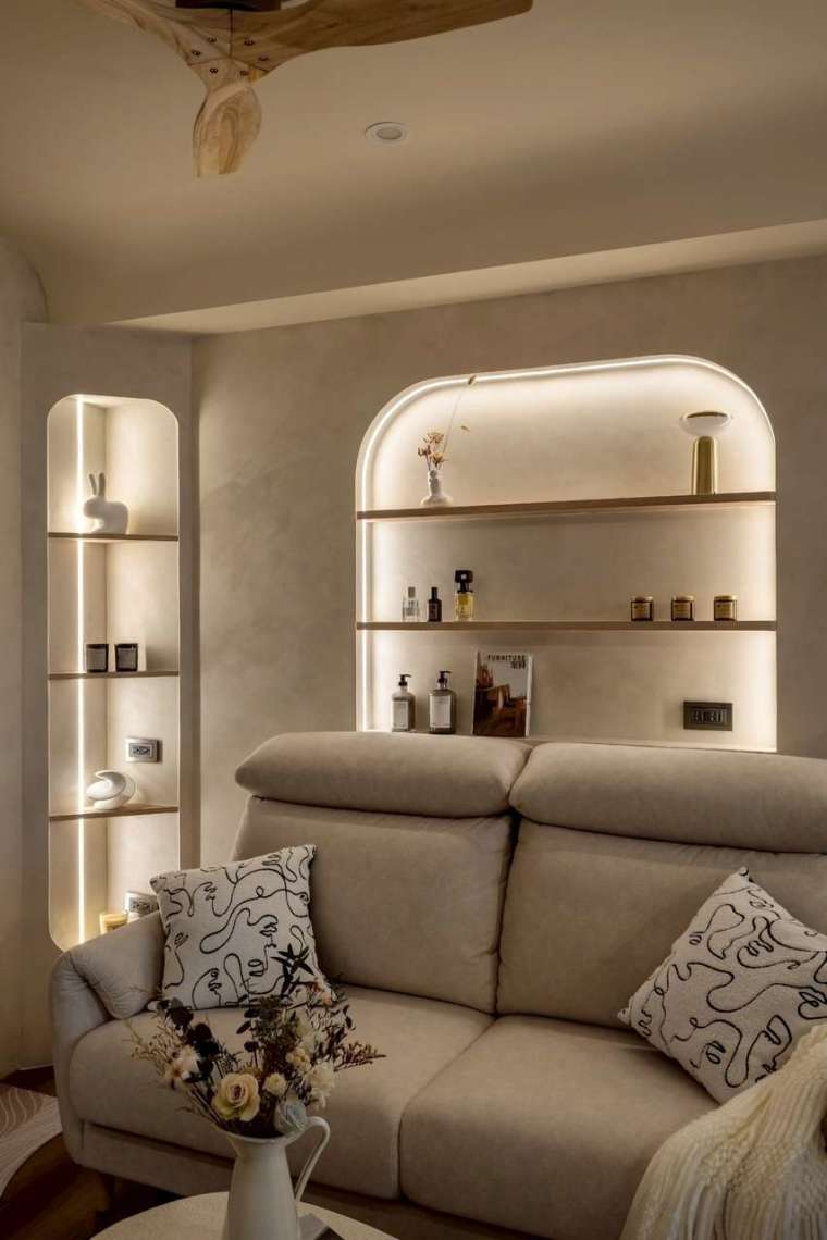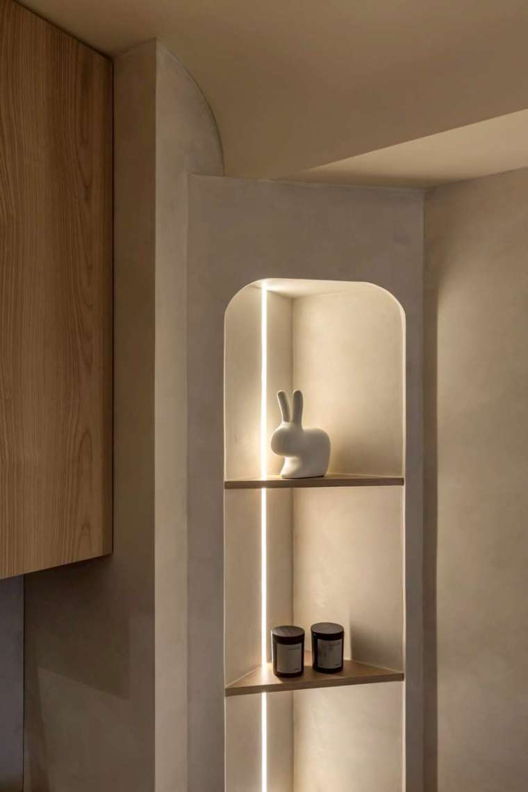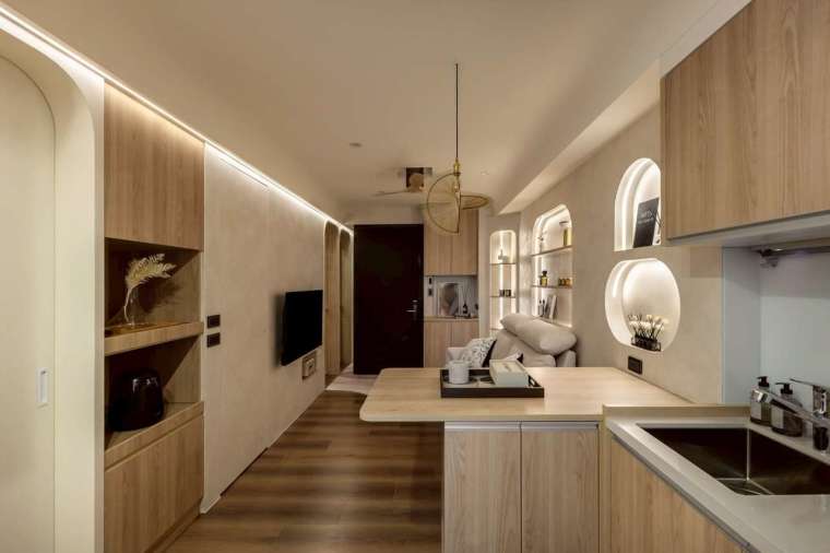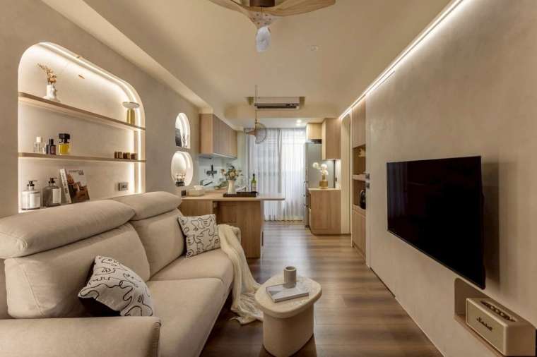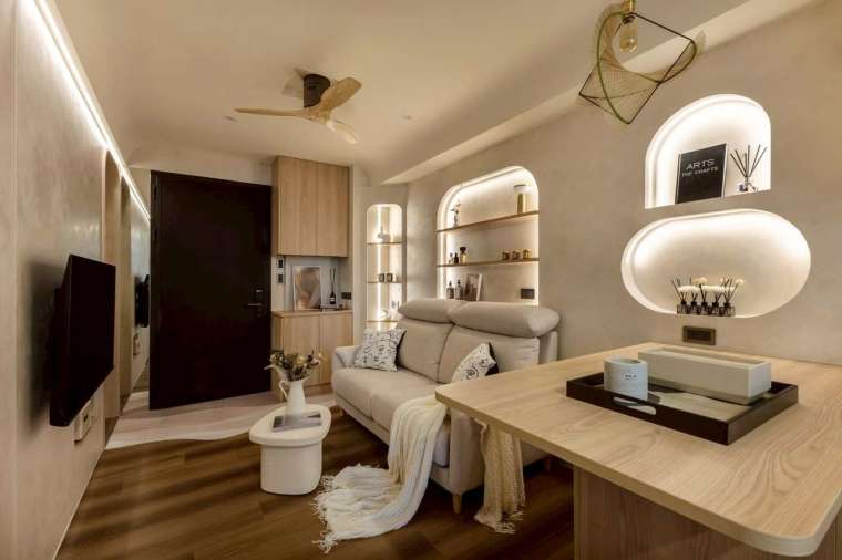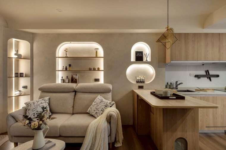 全室牆面大面積採用司曼特塗料,還原清水混凝土般的灰階肌理,搭配溫潤木地坪,營造低彩度卻層次豐富的調性。從拱形門片、弧形天花包梁,到壁龕中的香氛與間接光源,皆圍繞著「柔和」這個核心意象,使整體氣息靜謐而安定。其中沙發背牆設計為一道優雅的拱形壁龕,內嵌屋主珍藏的香氛瓶器,再以燈光輕柔投射,將喜好與美感自然呈現。天花板原有橫梁則被圓弧包覆,不僅消弭壓迫感,也維持挑高視野,使整體動線更顯流暢。