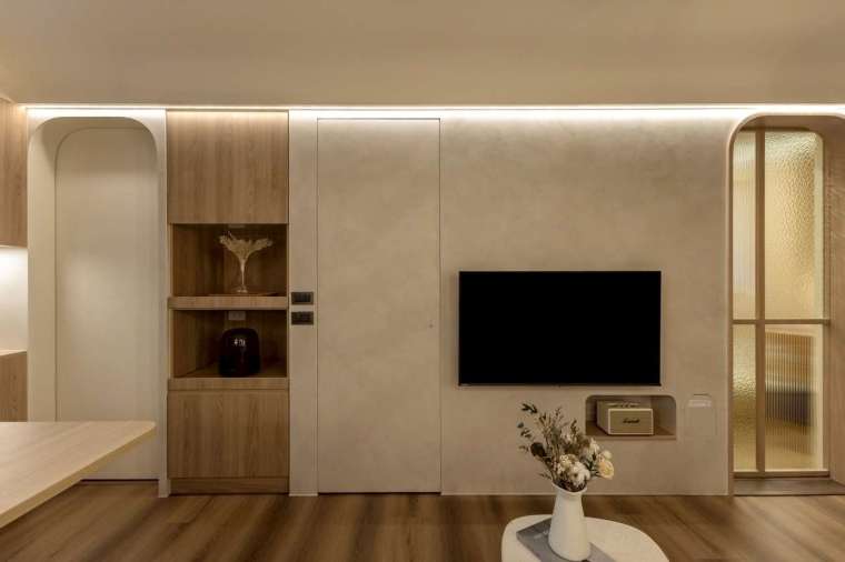為了讓視覺更完整,設計師針對格局進行細緻調整:面對電視牆右側的門口,原本是通往書房兼多功能房的動線,設計上略為右移,使整面電視牆的比例更寬、更具存在感;左側通往主臥的門則略為收窄,讓兩側釋放出的牆面整合為一體,為公領域注入大尺度的開闊觀感。電視牆下方的壁龕巧設音響收納,旁側嵌入的雙面櫃體則串聯起客廳與臥室的收納功能,展現高度整合的機能思維。