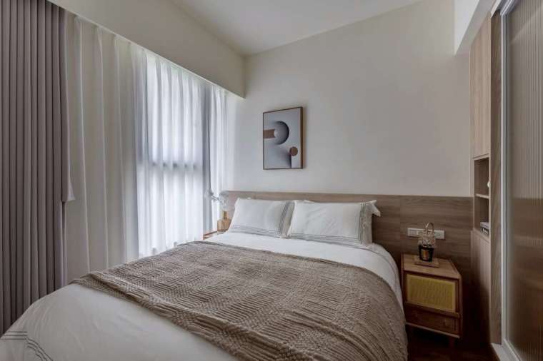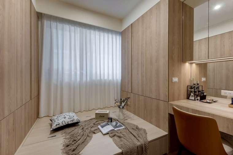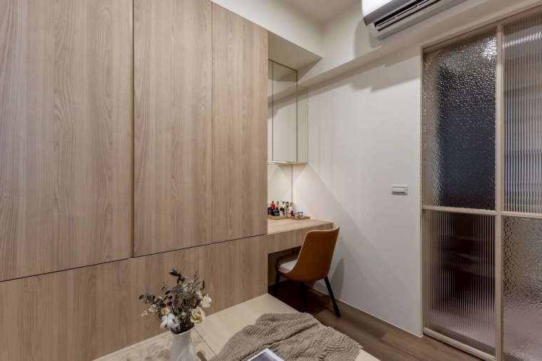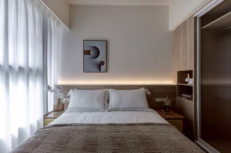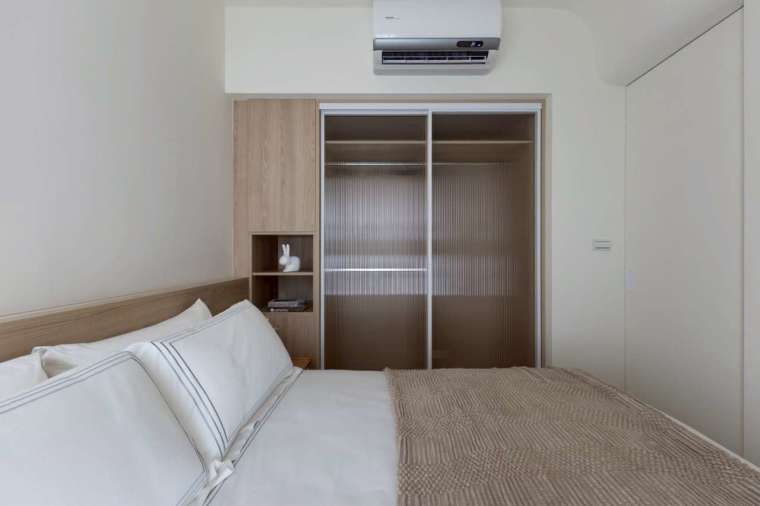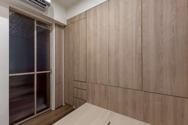 主臥室在有限坪數內,仍特意設置更衣間,並以水波紋玻璃拉門與外部呼應,帶出輕盈透澈的設計語感。在照明方面,設計師捨棄傳統主燈,改以嵌燈與間接光源逐層堆疊,使壁面更顯立體,當光影溫潤流動,溫馨生活感遠超越實際坪效的限制。