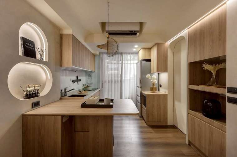 步入室內,首先映入眼簾的是設計師刻意劃分出的玄關緩衝地帶,透過不規則地毯與端景儲物櫃巧妙界定出空間分野,為返家的身心緩慢降速。客廳與廚房順勢展開在長條形格局中,中央設置一道實木中島,既為機能延伸,也自然區隔出兩者界線,還可兼作餐桌使用。中島立面開設的貓洞,貼心照顧毛孩自由進出的習性,讓家的氛圍多了份靈動與趣味。