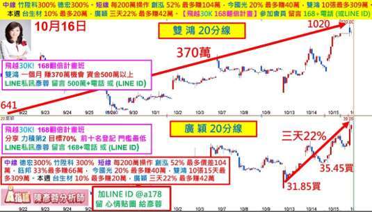 賀本欄預告 竹陞科 (6739-TW) ,德宏 (5475-TW),國精化 (4722-TW),金居 (8358-TW),南電 (8046-TW) 全部兩個月翻倍 100%。雙鴻 (3324-TW)15 天大漲 309 元! 東元 (1504-TW)1.5 個月翻倍 100%! 南亞科 (2408-TW),華邦電 (2344-TW) 全翻倍。16 日早上 7:30LINE 粉絲團預告 麗臺 (2465-TW),低到高 6% 收漲停! 想要領先於 每天早上九點前 得知當天誰有機會長紅漲停? 1-2 個月後資金翻倍 100%,歡迎點下面連接 加 LINE 留言 777+1 可領先得到提醒。