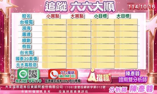 大來投顧陳彥蓉表示,美股受鮑爾暗示縮表尾聲,鴿派言論顯示月底再降息可能,資金行情有望再戰新高機會;台股受 ASML 季度財報報喜,及 2 奈米加速擴建台廠受惠,隨台積電法說登場有再創高時候。大盤上下震盪,買盤強勁台股換手成功!下波行情再起準備魚躍龍門,把握翻身機會,目標股將再出手!