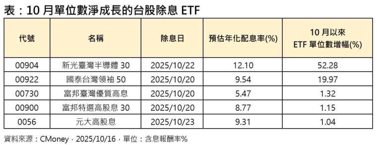 台股ETF 10月除息秀進入高峰 2檔高配息+高含積「黑馬」單位數猛增