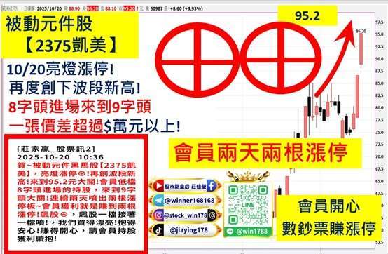 (2375-TW) 凱美,8 字頭進場來到 9 字頭,會員兩天兩根漲停,為國巨集團旗下鋁質電容廠,主力業務涵蓋電子電機、通訊、光學等領域,產品廣泛應用於 AI 伺服器與車用電子等高成長市場,近期營收穩健成長,年增率維持正向,受惠 AI 與車用題材發酵,吸引主力籌碼進駐,隨著 AI 伺服器與車用電子需求持續升溫,高規電容產品出貨動能增強,加上母公司國巨股價走強,帶動凱美人氣攀升。