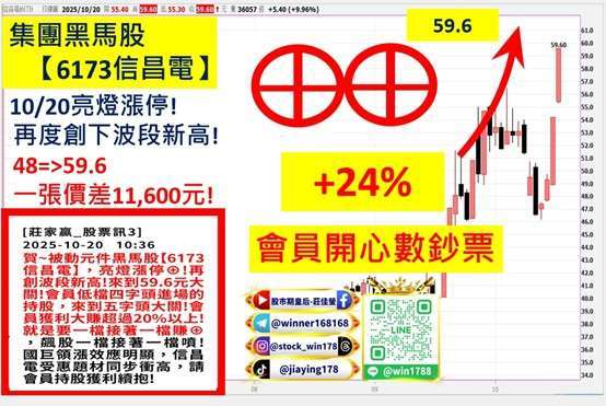 (6173-TW) 信昌電 48=>59.6 領先預告後大漲 +24%,今早盤強勢攻上漲停,人氣爆棚,隸屬華新科集團,主力業務涵蓋 MLCC 及瓷粉原料供應,產品應用於晶片電容、電阻與電感,深耕 AI 伺服器、電動車及 5G 基地臺等高階市場,產業長線需求看俏,盤中受惠 AI 與車用題材,主力籌碼積極進場,短線多頭氣勢明顯,AI 伺服器與車用電子需求升溫帶動被動元件族群資金回流,國巨領漲效應明顯,加上第三代半導體材料崛起,高功率、高電壓 MLCC 需求擴大,資金積極卡位,成為盤面亮點。