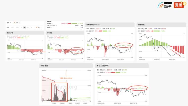 本周 BTC 再度重回 11 萬美元附近,多空拉鋸進入膠著階段。從 BTC 4h 數據儀表板觀察,目前市場正處於明顯震盪盤整格局,籌碼與情緒指標雖略有修復,動能保持低檔、主力動靜不大,雖有少量買盤出現,但整體多空力道指標趨近平衡。