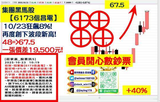 (6173-TW) 信昌電, 48=>67.5 領先預告後大漲 +40%,今早盤強勢,隸屬華新科集團,主力業務涵蓋 MLCC 及瓷粉原料供應,產品應用於晶片電容、電阻與電感,深耕 AI 伺服器、電動車及 5G 基地臺等高階市場,產業長線需求看俏,盤中受惠 AI 與車用題材,主力籌碼積極進場,短線多頭氣勢明顯,AI 伺服器與車用電子需求升溫帶動被動元件族群資金回流,國巨領漲效應明顯,加上第三代半導體材料崛起,高功率、高電壓 MLCC 需求擴大,資金積極卡位,成為盤面亮點