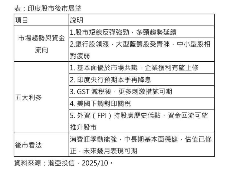 瀚亞投信表示,印度股市具備五項利多因素,有望支撐多頭格局持續。包括:基本面優於市場共識,企業獲利有望上修;市場預期印度央行本季將再度降息;GST 減稅後,預期將有更多刺激措施陸續推出;美國下調對印度課徵的關稅;外資(FPI)持股部位目前處於歷史低點,資金回流可望進一步推升股市。